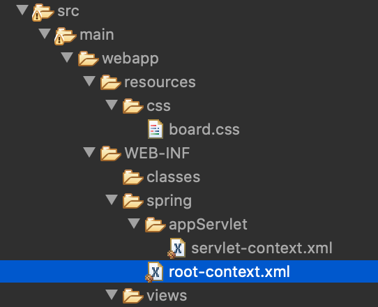 기존에 빈 컨테이너 역할을 하는 root-context.xml 파일의 위치는 왼쪽 이미지와 같다.
