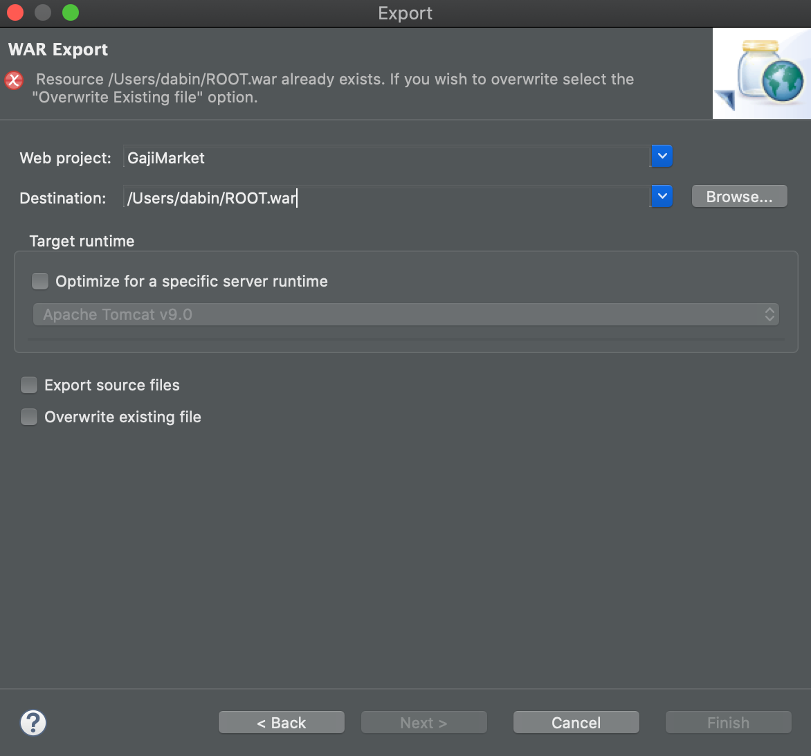 ROOT.war로 설정한 것은 현재 프로젝트의 cotext root가 '/'로 설정되어있기 때문 (위에 경고 문구는 무시)