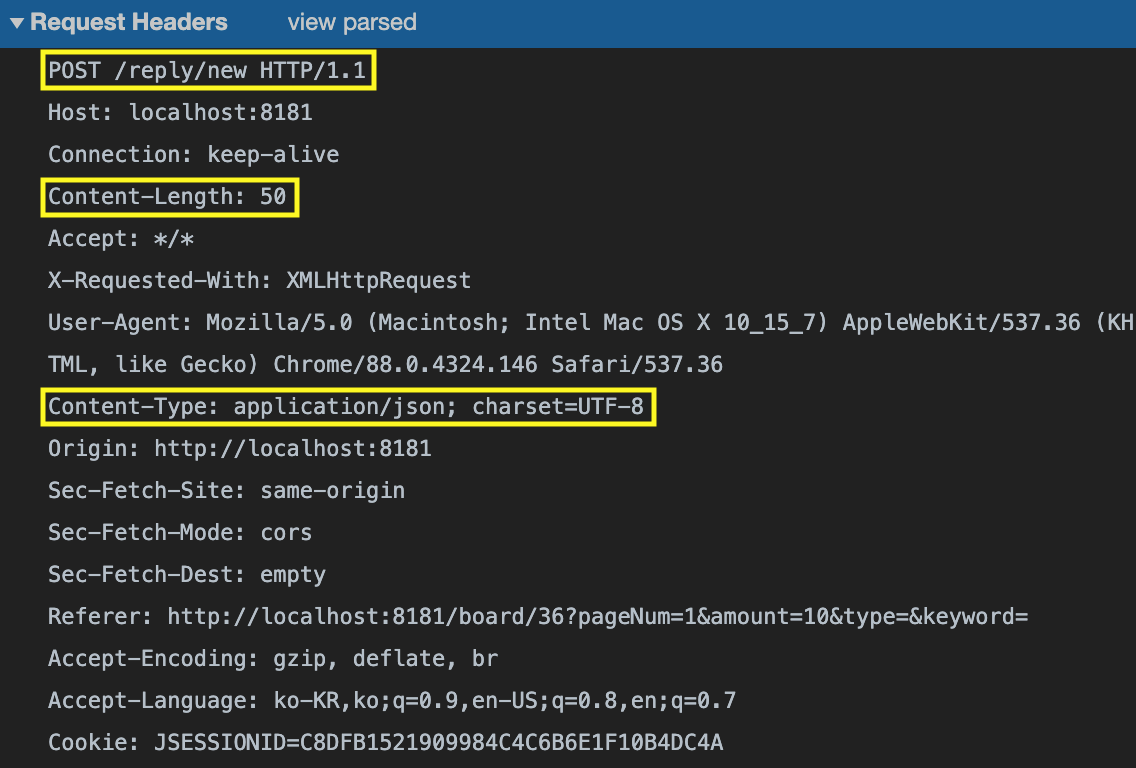 해당 요청이 보내는 메세지 body 타입을 말함. JSON을 보내면 application/json; (아래 확인)