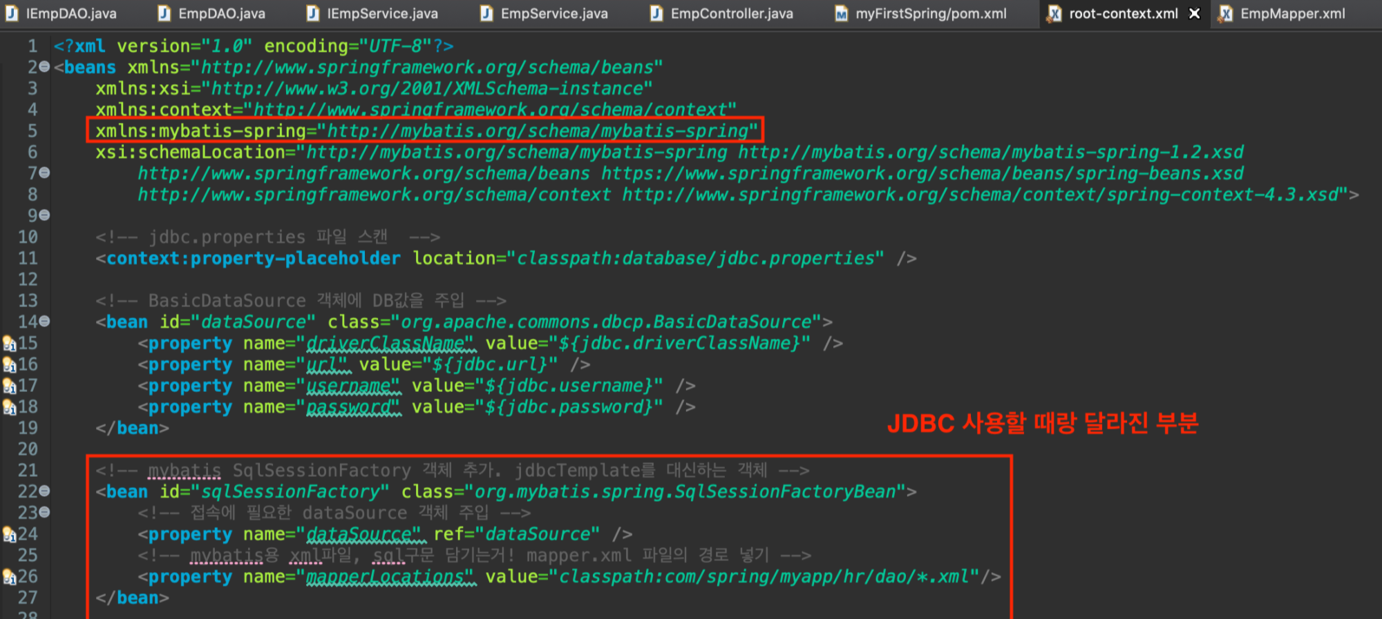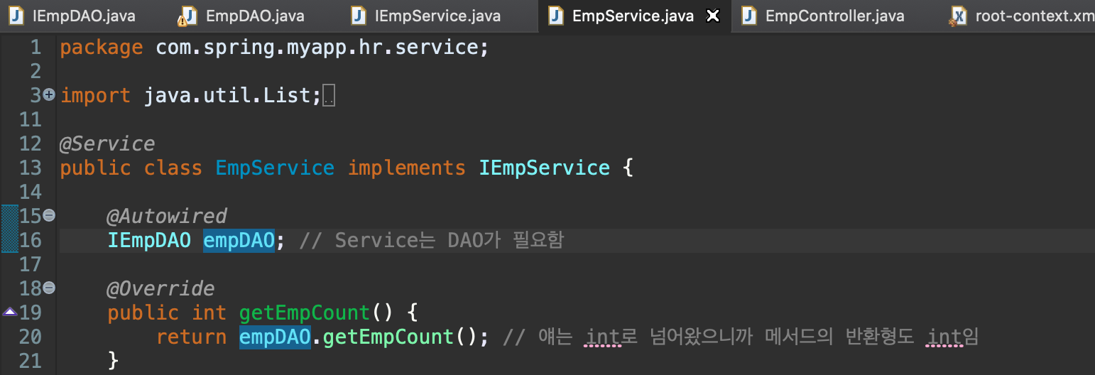 - 같은 경로에 있는 인터페이스 IEmpDAO를 구현하는 파일 = jdbc에서 IEmpDAO 인터페이스를 구현한 EmpDAO 클래스와 동일한 역할