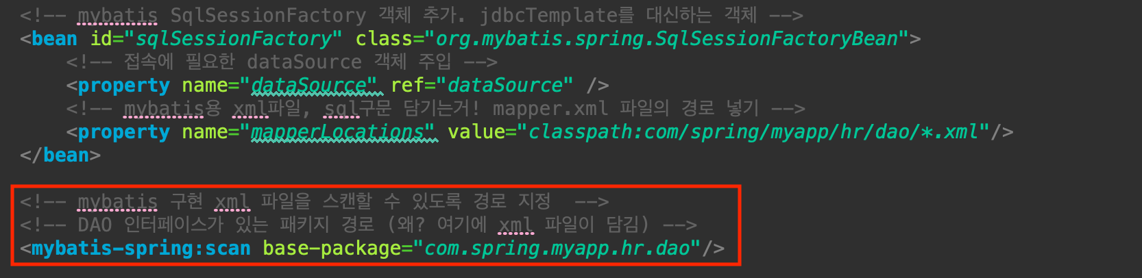 - base-package 에는 DAO 인터페이스가 있는 패키지 경로를 적어줌, 실제로 xml 파일도 여기에 들어있을 예정