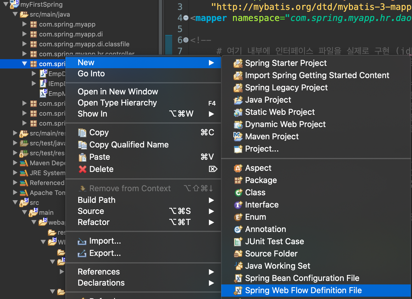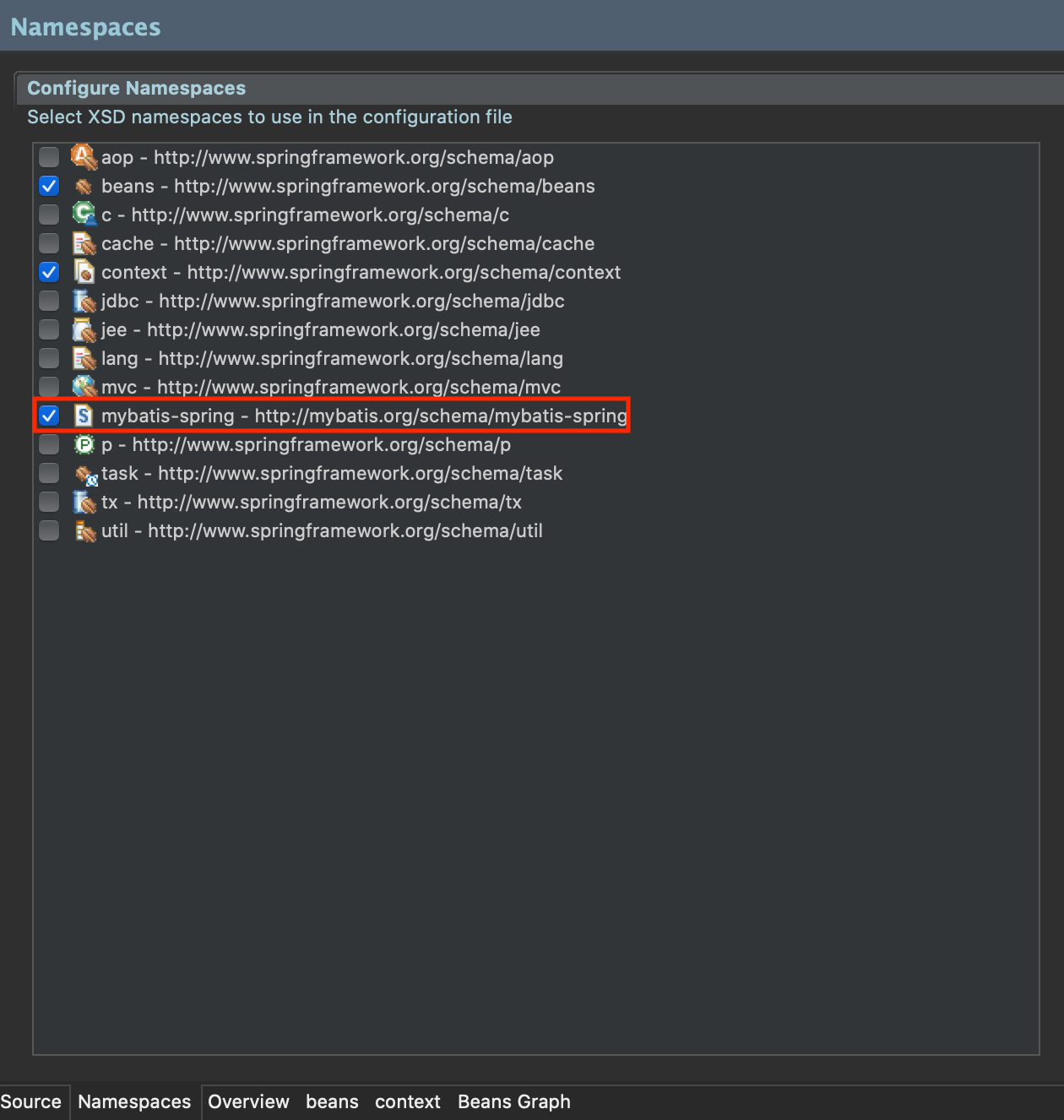 namespace에서, mybatis-spring 체크 (상단 이미지에서 추가된 것을 알 수 있음)