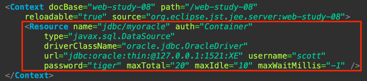 2) servers 폴더의 server.xml 파일에서 진행하는 프로젝트 <Context> 태그 안에 <Resource> 태그 추가