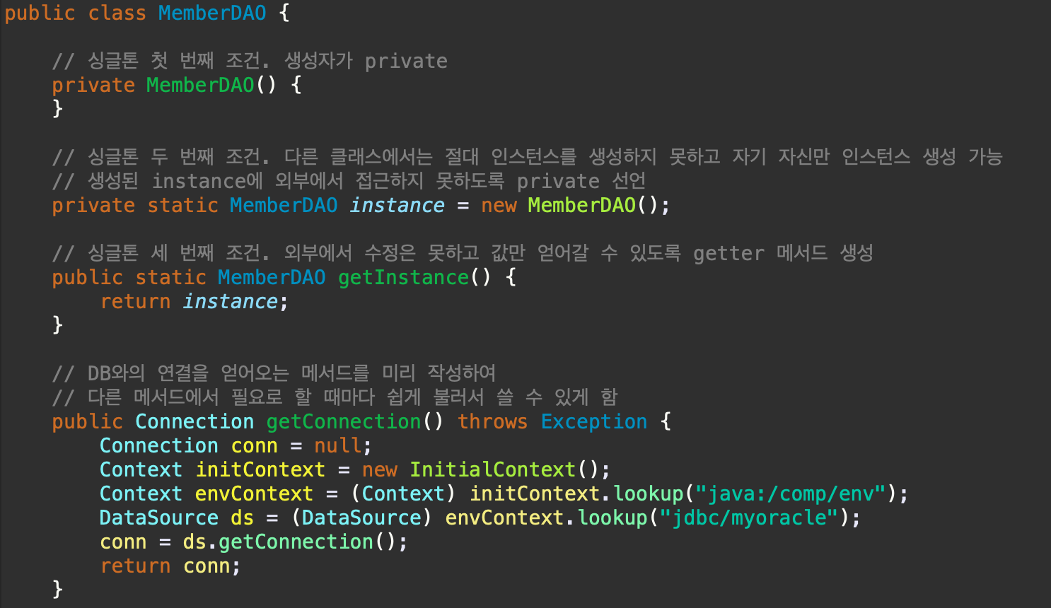- 원래 JSP에서는 DB에 접근할 때마다 객체를 생성하여 사용하였다. 따라서, 이러한 부하를 해결하기 위해 싱글톤 패턴으로 설계