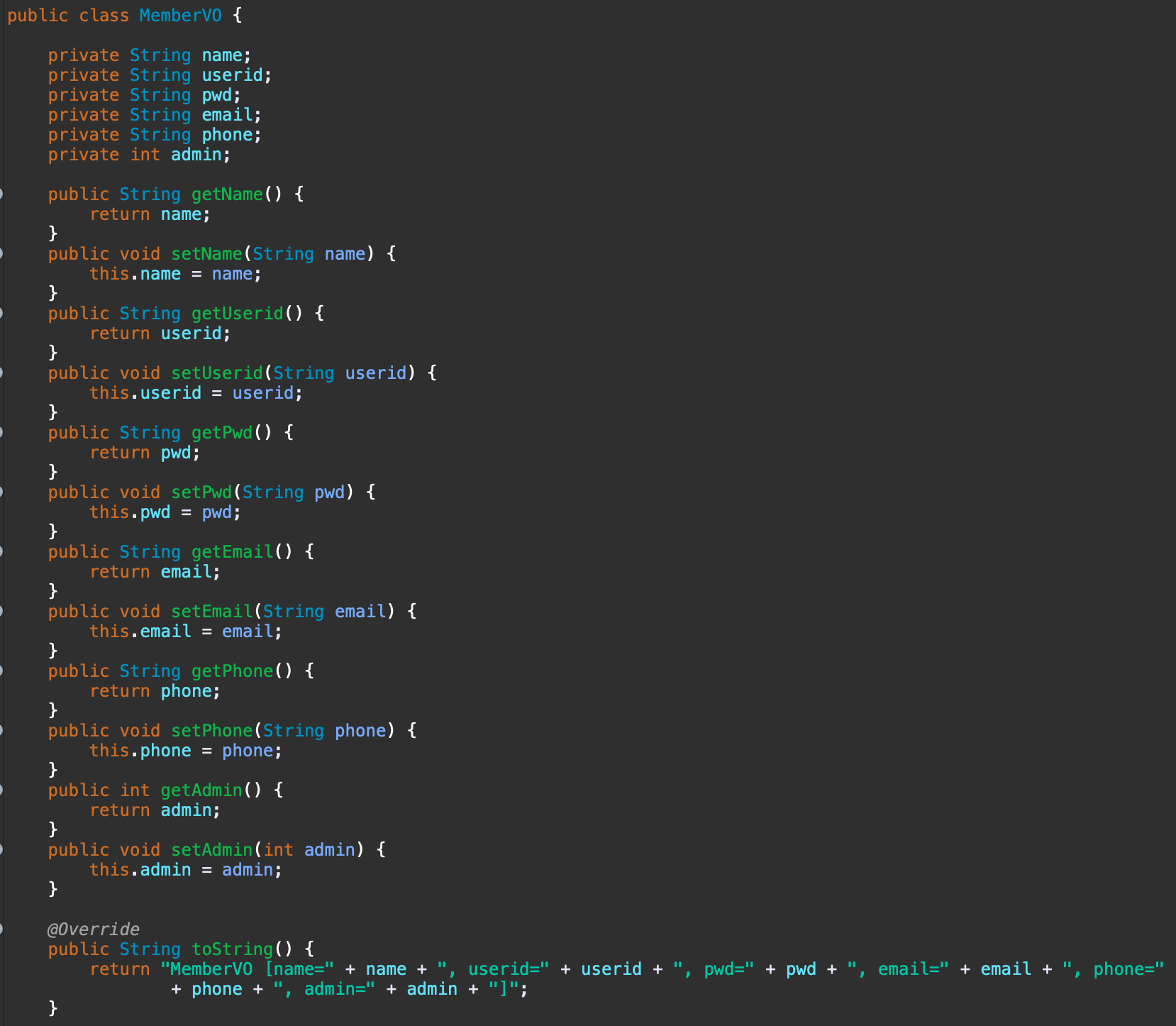 - DB 데이터를 VO 객체로 얻어오거나 VO 객체에 저장된 값을 DB에 추가
