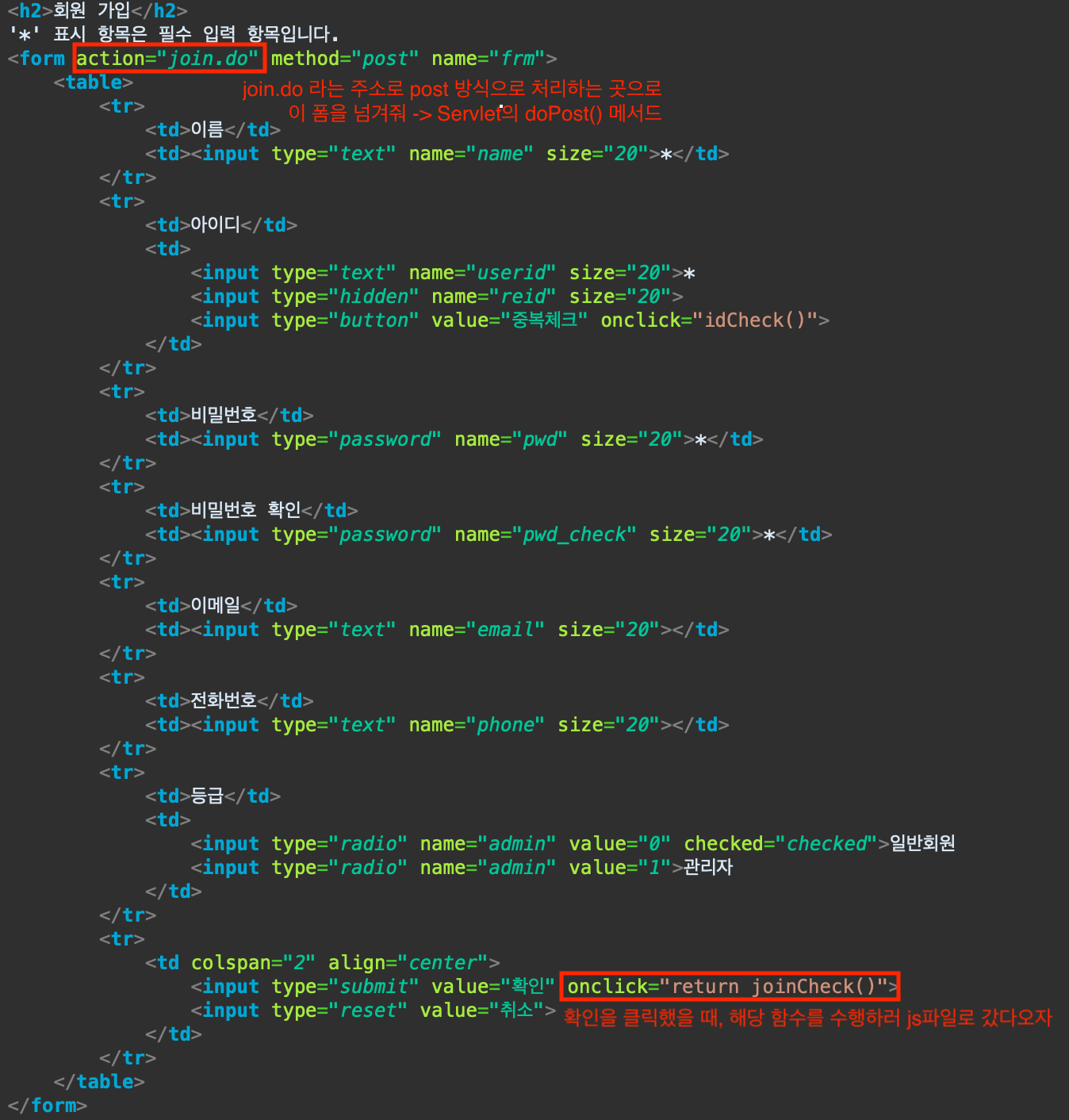 - 주소창에 join.do 라는 입력이 들어오면, 해당 서블릿의 doGet() 메서드를 실행하라 -> 첫 번째 수행이 되는거지!