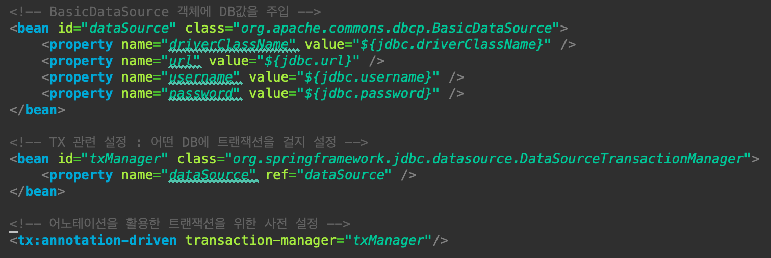- datasource / txManager / <tx:advice> / <aop:config> 설정