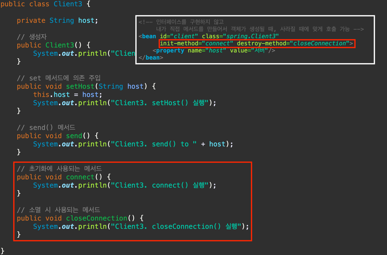 <bean id="client3" class="spring.Client3" init-method="connect" destroy-method="closeConnection">