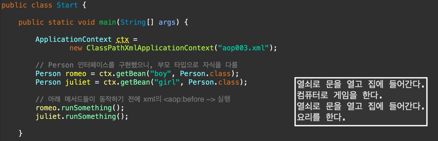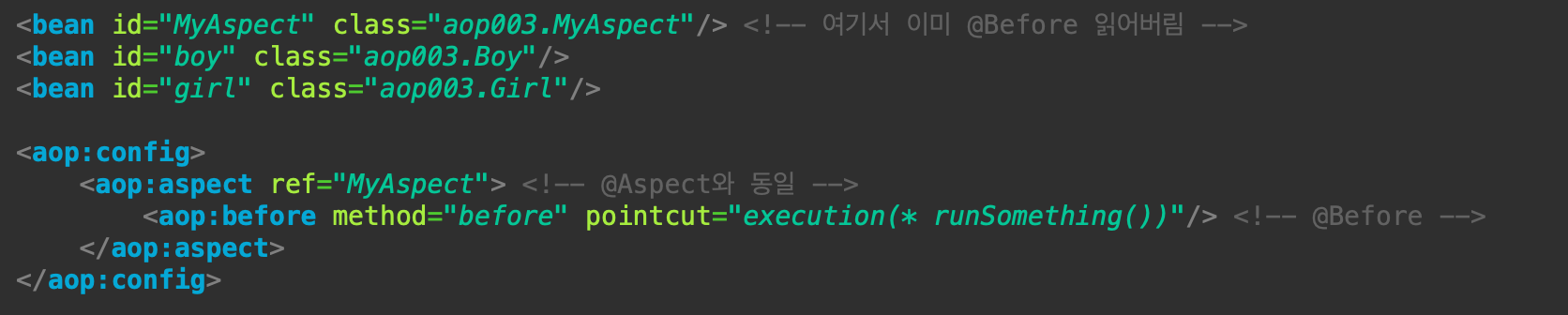 XML에서 <aop:config> <aop:aspect> <aop:before> 태그를 이용하여 모든 조건을 걸어줬음