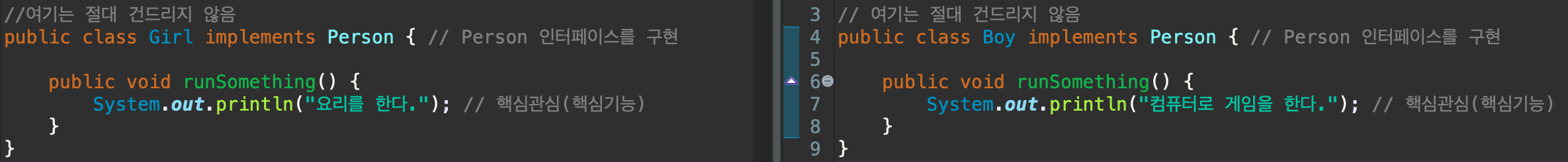 인터페이스를 구현했으니 이제 Boy Girl은 부모 타입인 Person으로 다룰 수 있게 된다.